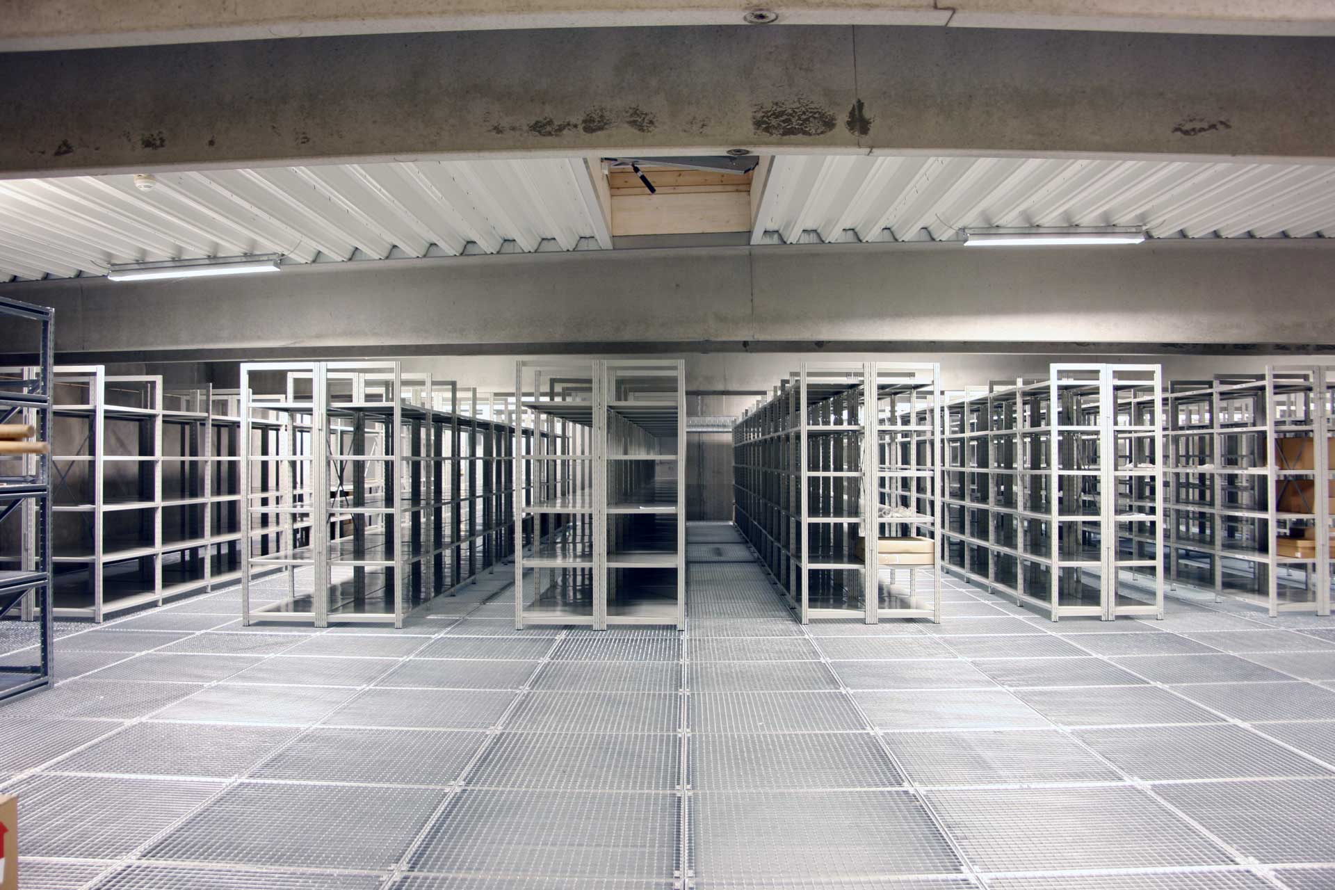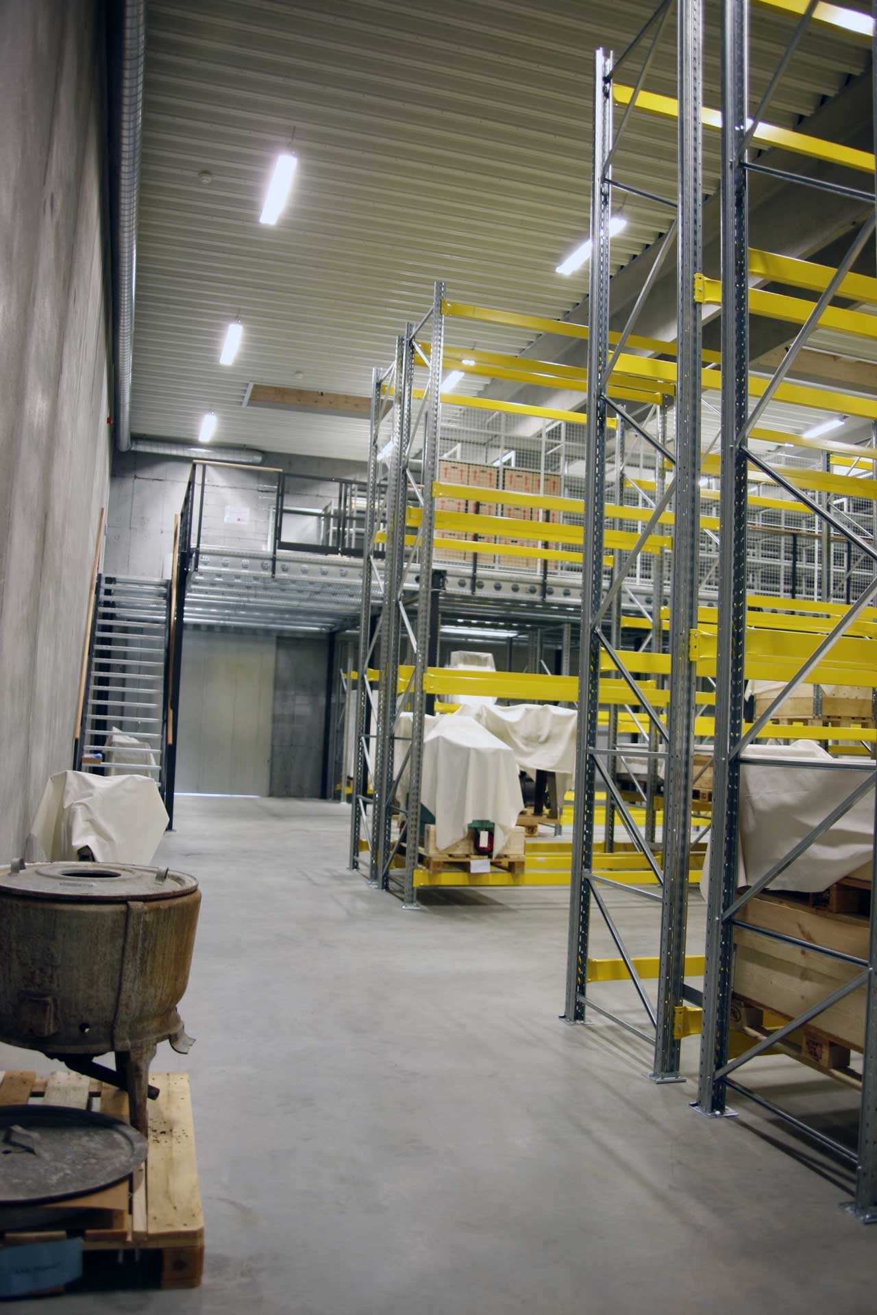 Under mezzaninen er der lagerreoler med i alt 326 fag