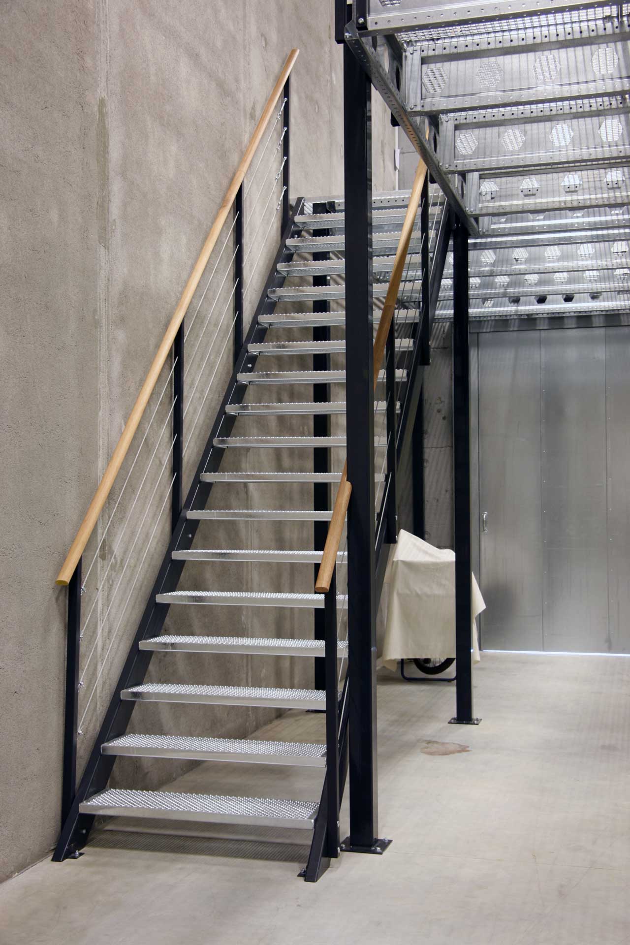 Stålplatformen er opbygget med sigmaprofiler monteret i ét plan. Overalt er der ristegulv som b.la tillader at der trænger lys til arealet under mezzaninen. Gelænderet, hvoraf flere meter er aftagelig, består af lakerede stålsøjler med stålwire og mahogni håndliste. Der er monteret fjederbelastede palleporte og trapper er med skridsikre galvaniserede trin og lakerede vanger.