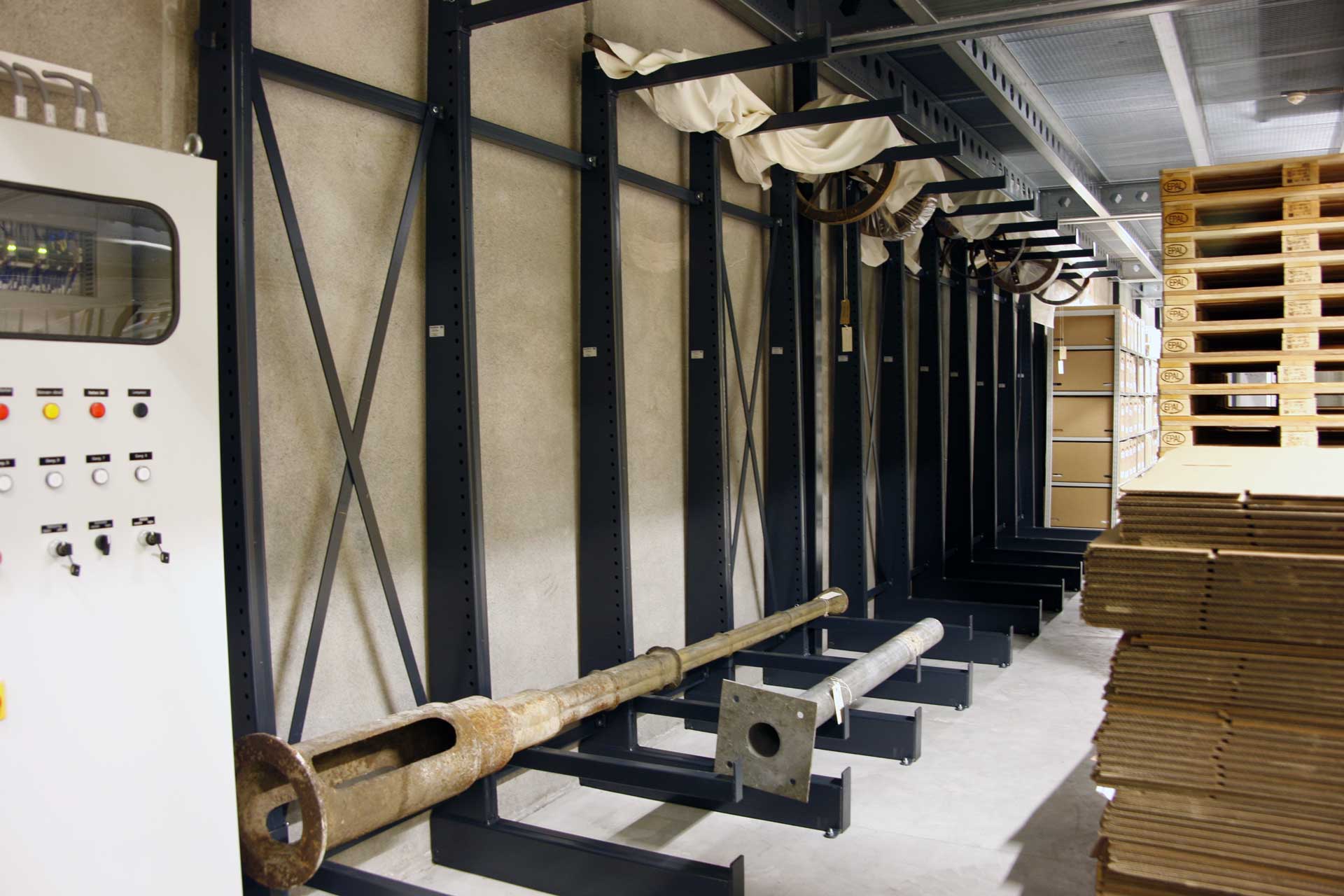 Til de mobile reoler er en central styringstavle med positionslamper. Systemet har automatik visning af forstyrrelse i gange og styring af kørsel af vogne til jævnt fordelte positioner. Der er 8 stk. mobile reolvogne, hver med 2×4 fag 1000×3575 mm + 2×5 fag 1000×2700 mm.