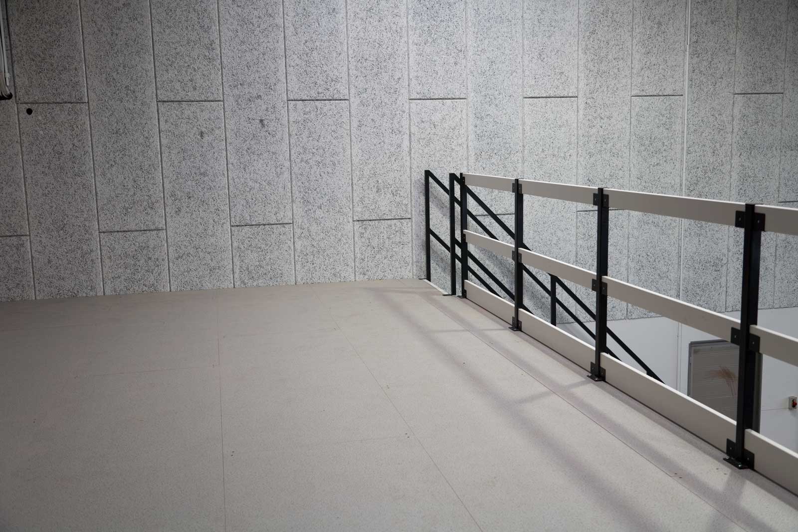 Der er monteret gelænder af lakerede stålsøjler med hvid MDF mod åbne sider samt fjedrebelastet palleport med aluplade på gulv.