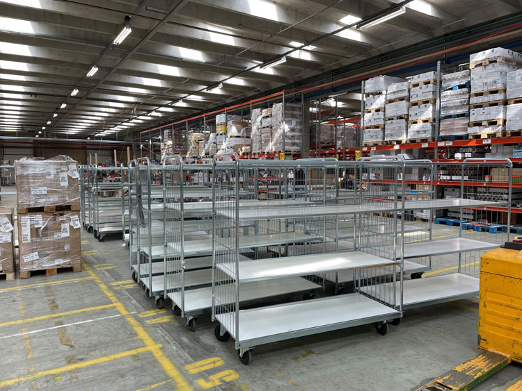 Plukkeprocessen foregår 100 % manuelt, fordi det fungerer effektivt, uden fejl og det er muligt at skaffe kvalificeret arbejdskraft – og vigtigst af alt: Det er skalerbart. Software styrer plukkernes rute gennem reolerne, til de varenr. og det korrekte antal, og varerne placeres i dedikerede kasser på vogne, som medarbejderne skubber med sig rundt på ruten.