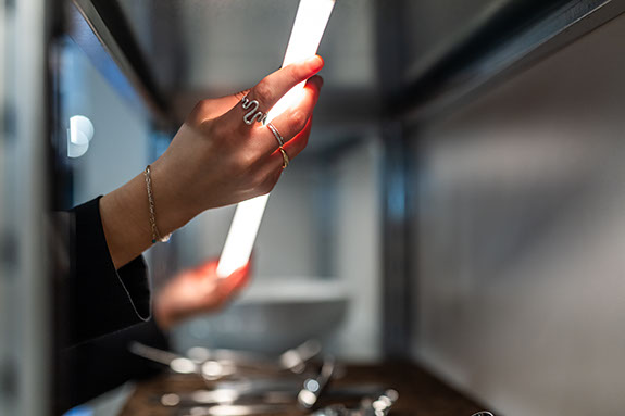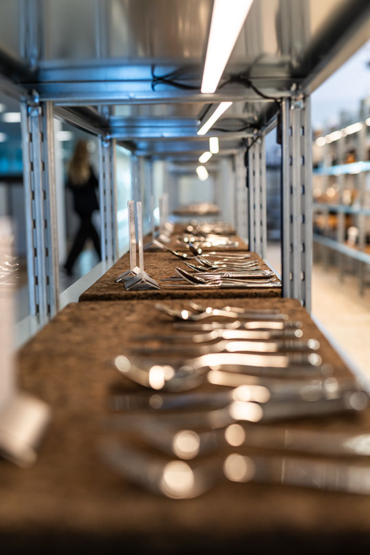 Løsningen blev de galvaniserede lagerreoler fra italienske ROSSS, der fik indbygget lys, og indgik i det samlede design, som Laboratoriet ApS har stået for.