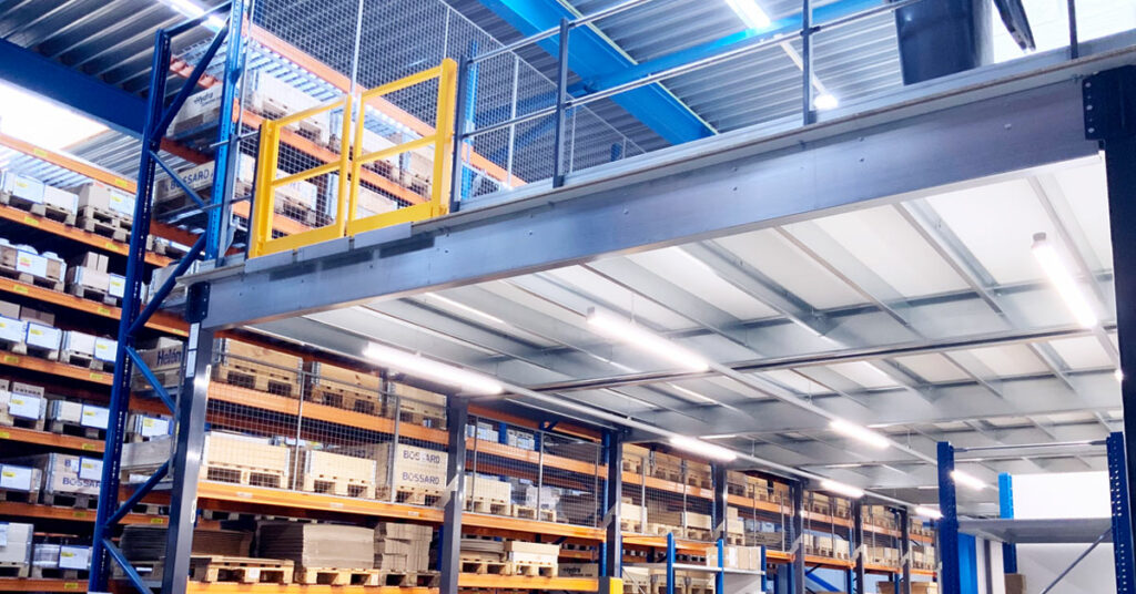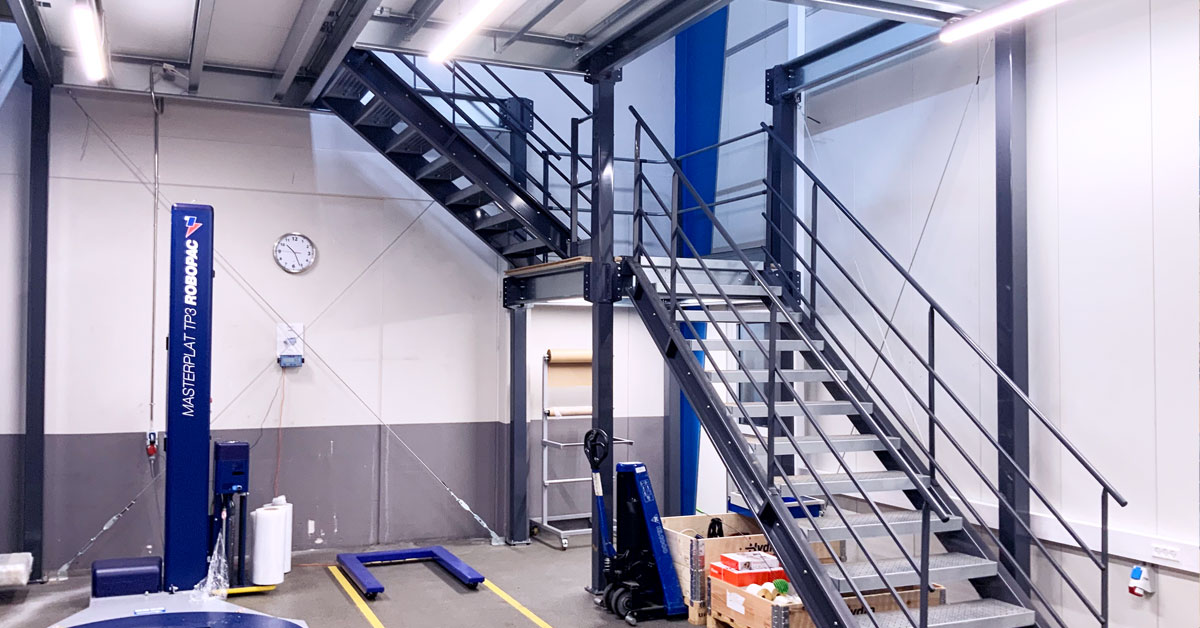 Mezzaninen er opbygget i et smalt område bag en række pallereoler, og den er tegnet og konstrueret, så hver centimeter mellem pallereolen og væggen udnyttes.