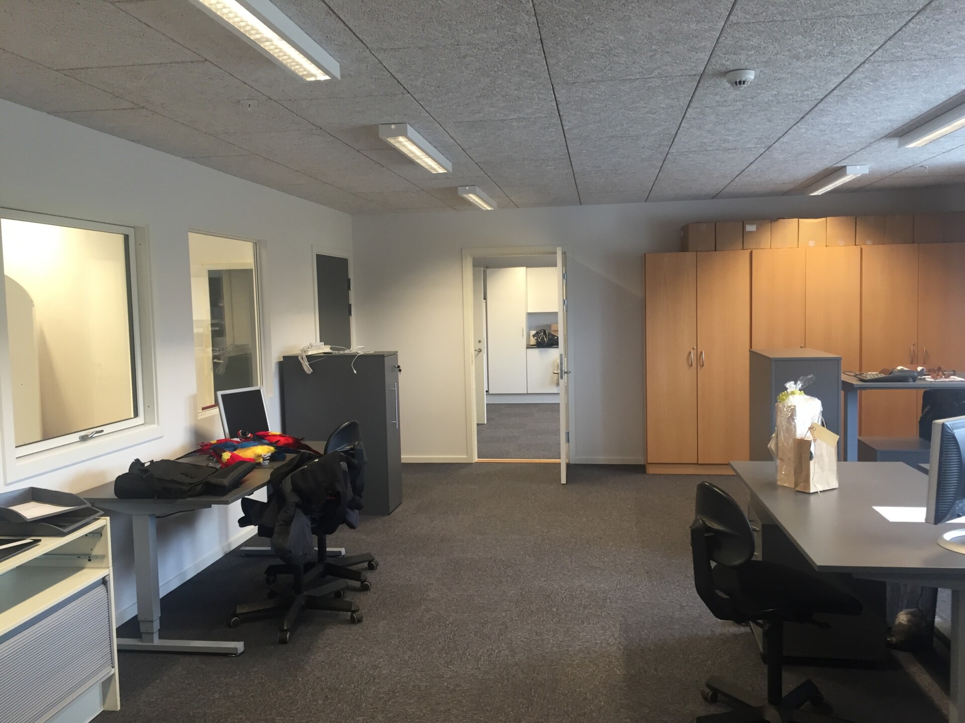 Det skal ikke blive for teknisk, men det gælder i hovedtræk, at kontorerne skal være varmeisolerede efter klasse 37 isoleringsevne, og at overfladerne rent brandteknisk har en klasse 1 beklædning, som betyder, at materialet ikke kan bidrage til en brand. Så det er et mindre parcelhus, der er bygget på mezzaninen, bygget med kvalitetsmaterialer hele vejen rundt.