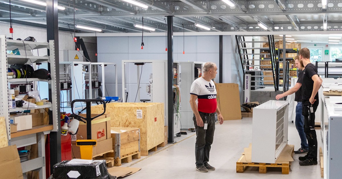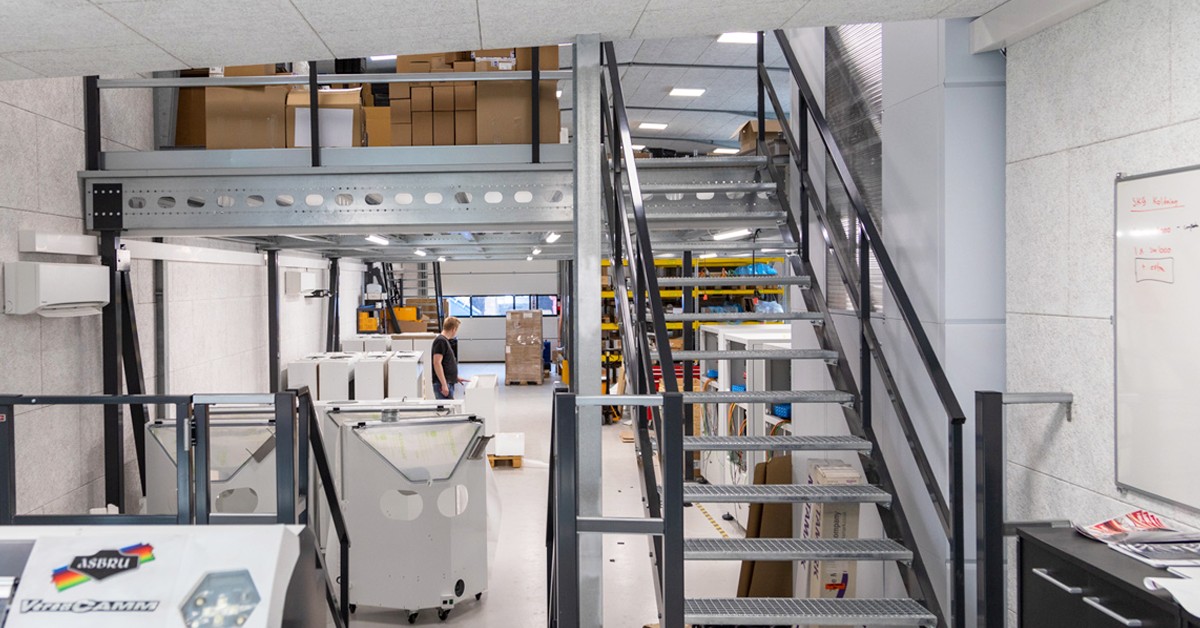 Den nye lagerhal er indrettet med pallereoler i den ene ende, hvor delkomponenter til robotproduktionen opbevares. I den anden ende er lagerreoler og lagerautomat placeret og i midten står en mezzanin, som deler rumhøjden op og giver 146 m2 mere. Værkstedet til produktion af eltavler og robotter er placeret under mezzaninen og pakkeriet er placeret ovenpå.
