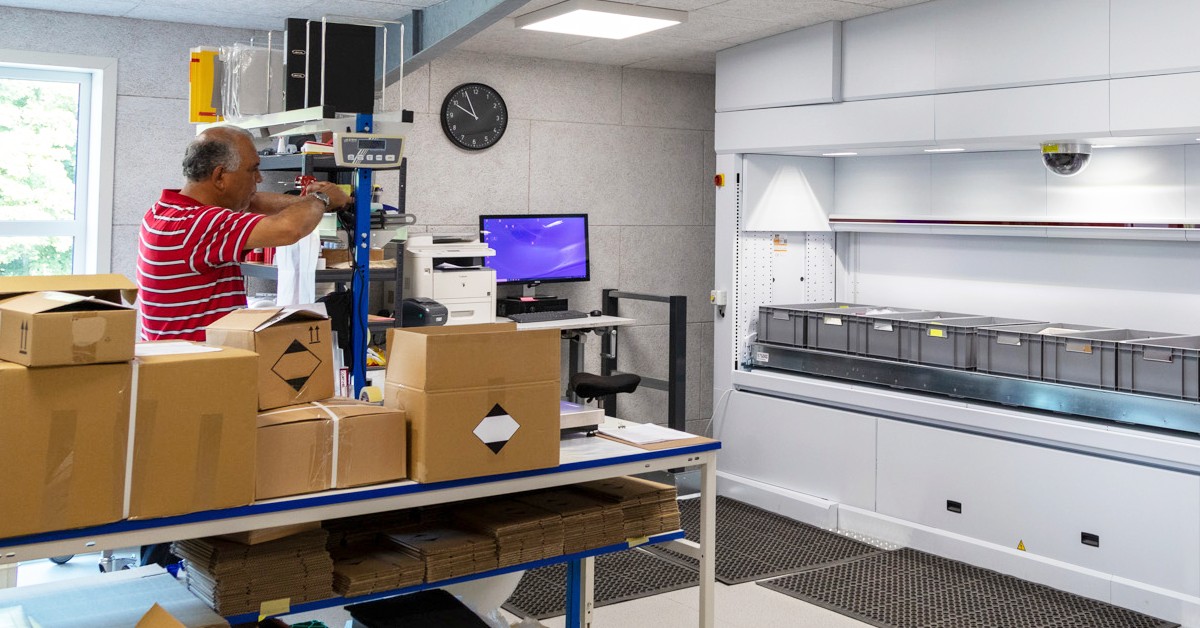 Lagerautomaten er placeret, så den understøtter processerne i ordreplukningen og -pakningen, som foregår ovenpå mezzaninen, og derfor er lagerautomaten monteret med plukkefaget øverst i stedet for nederst, som er den mest typiske løsning.