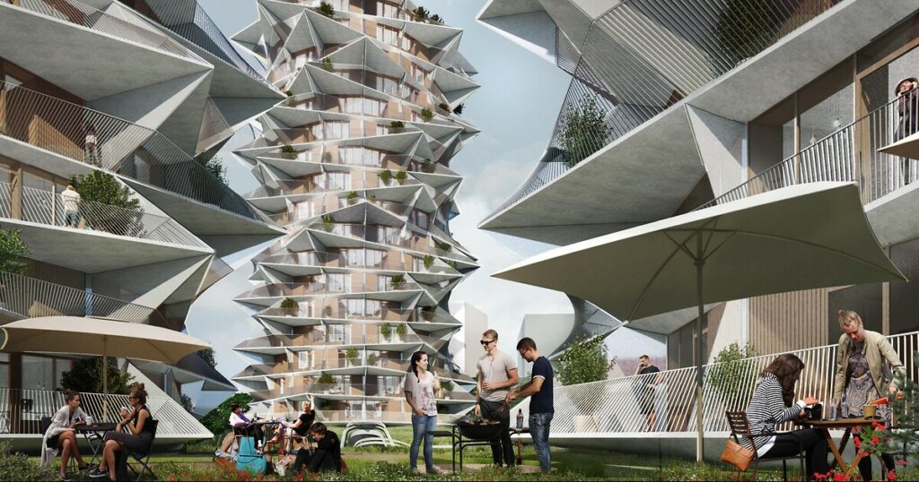 Arkitekturen er iøjnefaldende, og bag facaden er der 431 boliger, som er en blanding af hotelværelser og ungdomsboliger.