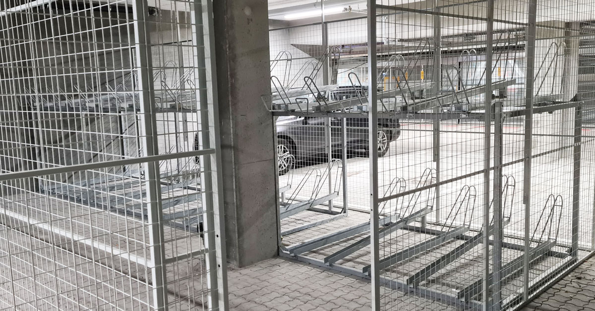Underentreprisen omfatter også cykelstativer i parkeringskælderen og udenfor i terræn. I kælderen er der skabt plads til mange cykler ved at kombinere cykelstativer i 2 etager med cykelstativer i 1 niveau. I enkelte områder er der indrettet aflåst cykelparkering, som er afgrænset med åbne netvægge i stål.