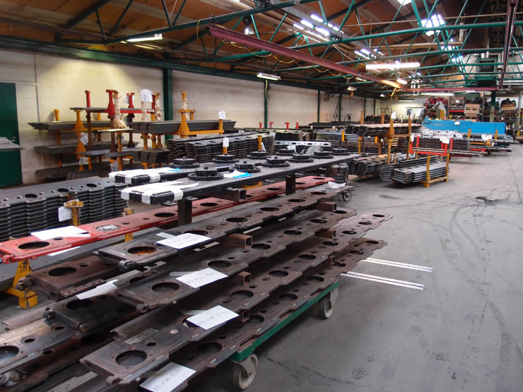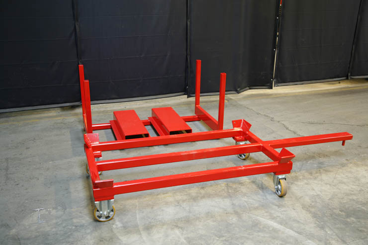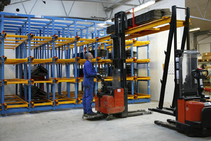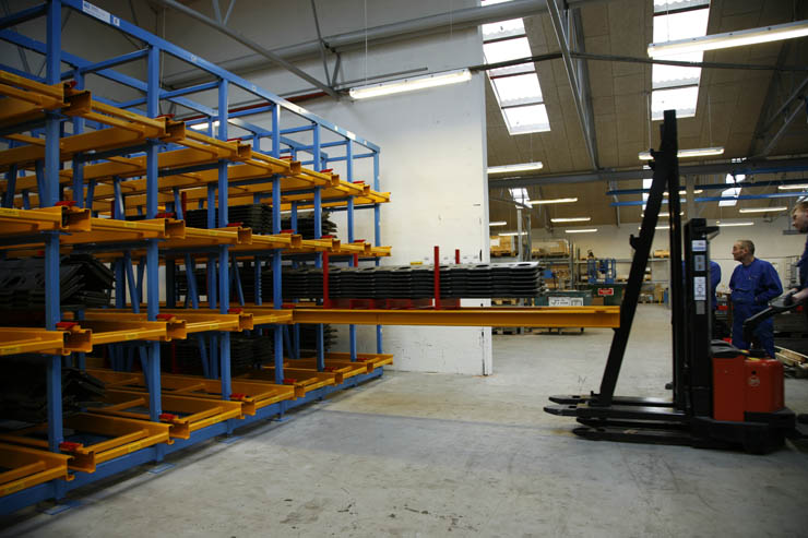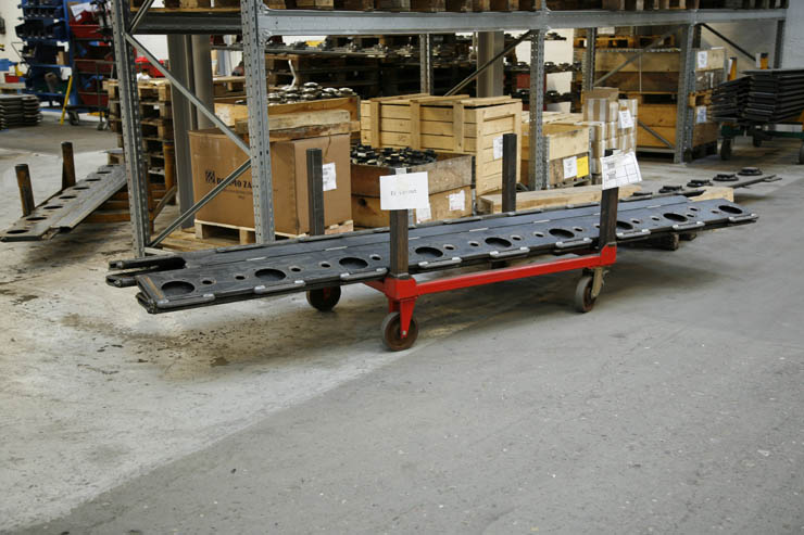 Normalt foregår ind og udlagring i reolen ved hjælp af en loftkran, men Kverneland ønskede at kunne håndtere emnerne fra siden med en gaffeltruck. Dette blev løst med fremstillingen af 54 stk. stålpaller og 8 stk. tilhørende vogne med hjul, således at godset i princippet håndteres som med en “jernseng”