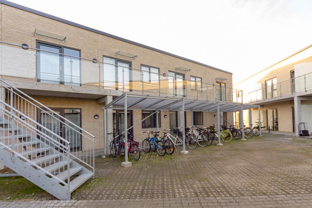 På Engtoften 12 i Viby ved Aarhus står der fine rækker af nybyggede boliger med udendørs cykelparkering. Her står beboernes cykler i læ for regn og slud i den overdækkede cykelparkering.