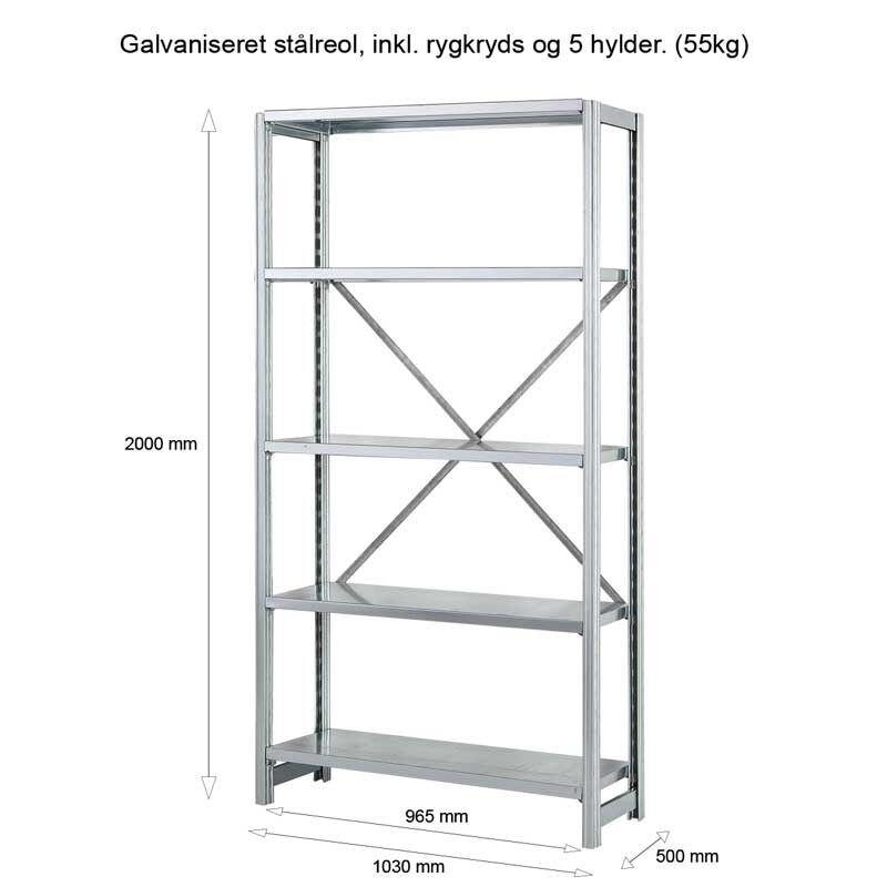 5 stk. galvaniserede hylder 965×500 mm (Belastning pr. hylde 55 kg)