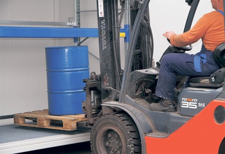 Når beholdere eller tønder med farlige kemikalier skal lagres og lagringen kræver brug af gaffeltruck, er det altid nødvendigt med et brandsikkert lager